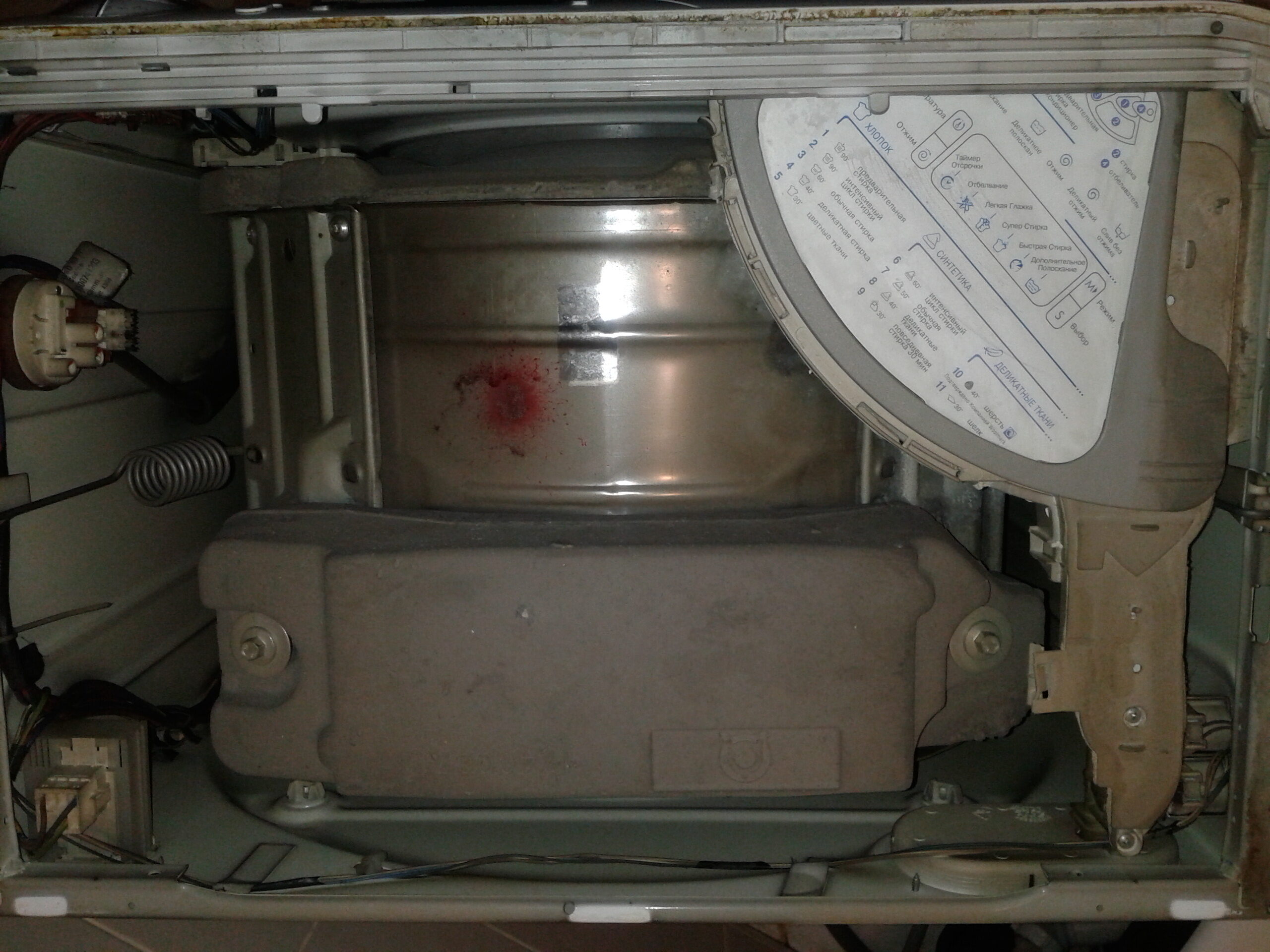 Обратите внимание на количество грязи внутри. Какая-то паутина и осколочки от керамических (?) частей машинки. Самое интересное, что подобраться туда можно только перевернув стиральную машину. А когда вы в последний раз заглядывали туда?